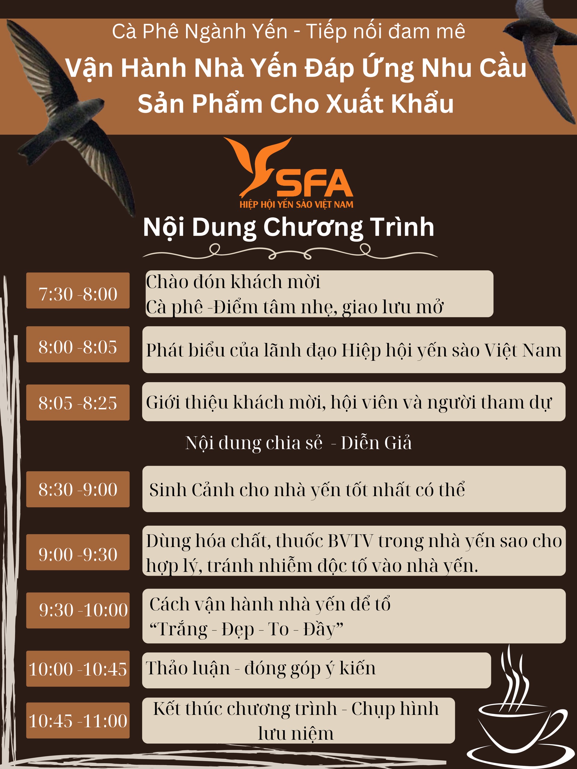 Buổi toạ đàm là một phần của chuỗi chương trình “Cafe Ngành Yến – Tiếp Nối Đam Mê,” do Hiệp hội Yến sào Việt Nam tổ chức định kỳ nhằm tạo nền tảng, nơi giao lưu để chia sẻ thông tin, kinh nghiệm và nâng cao kiến thức của cộng đồng yến sào Việt Nam.