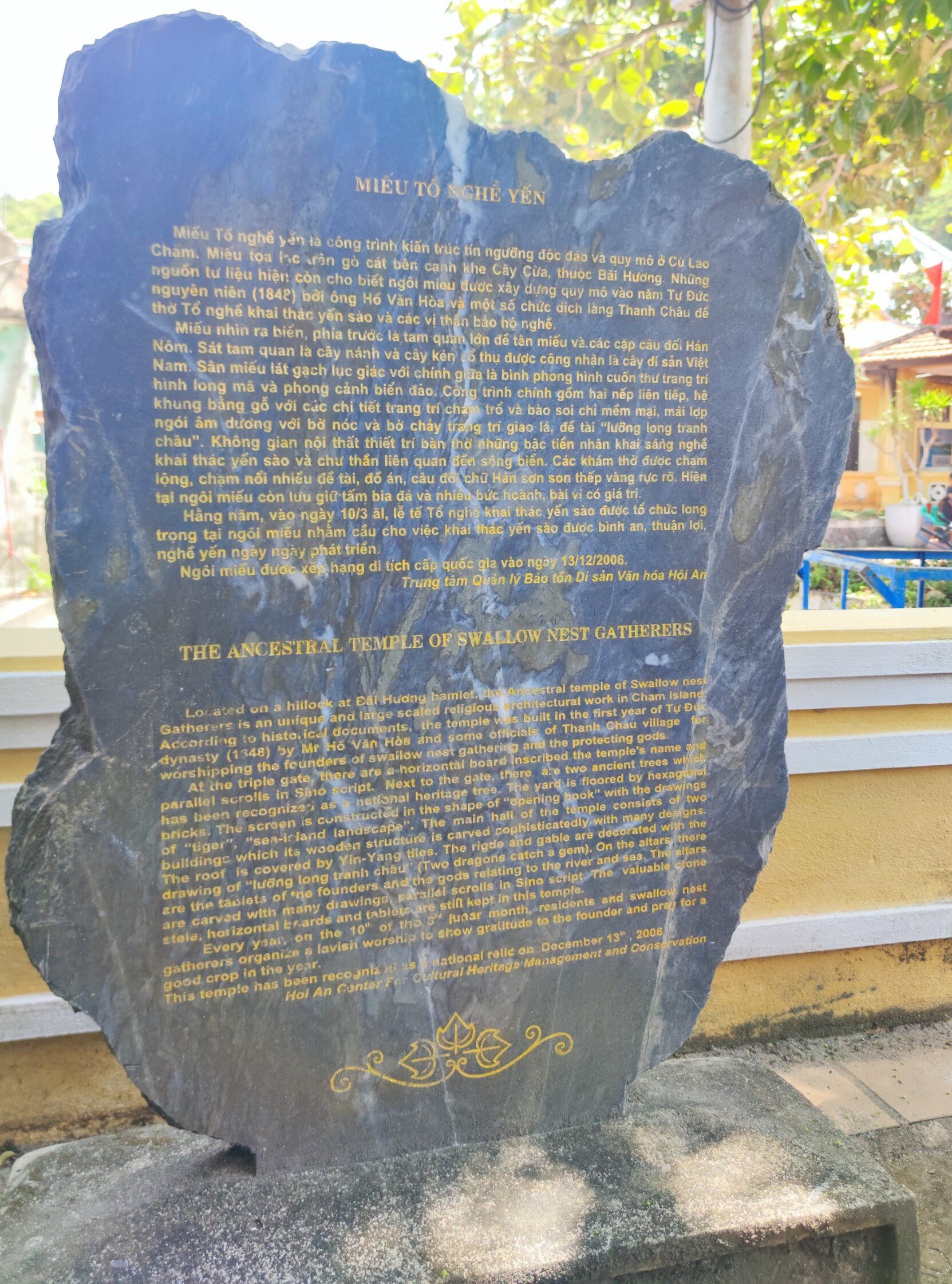 Trên bức tường bên phải còn lưu lại tấm bia ghi nhớ công đức của các bậc tiền nhân và ca ngợi cảnh núi non hùng vĩ của đảo du lịch Cù Lao Chàm. Hiện nay trong miếu còn lưu giữ nhiều tấm bia ký và nhiều bức tranh có giá trị văn hóa cao.