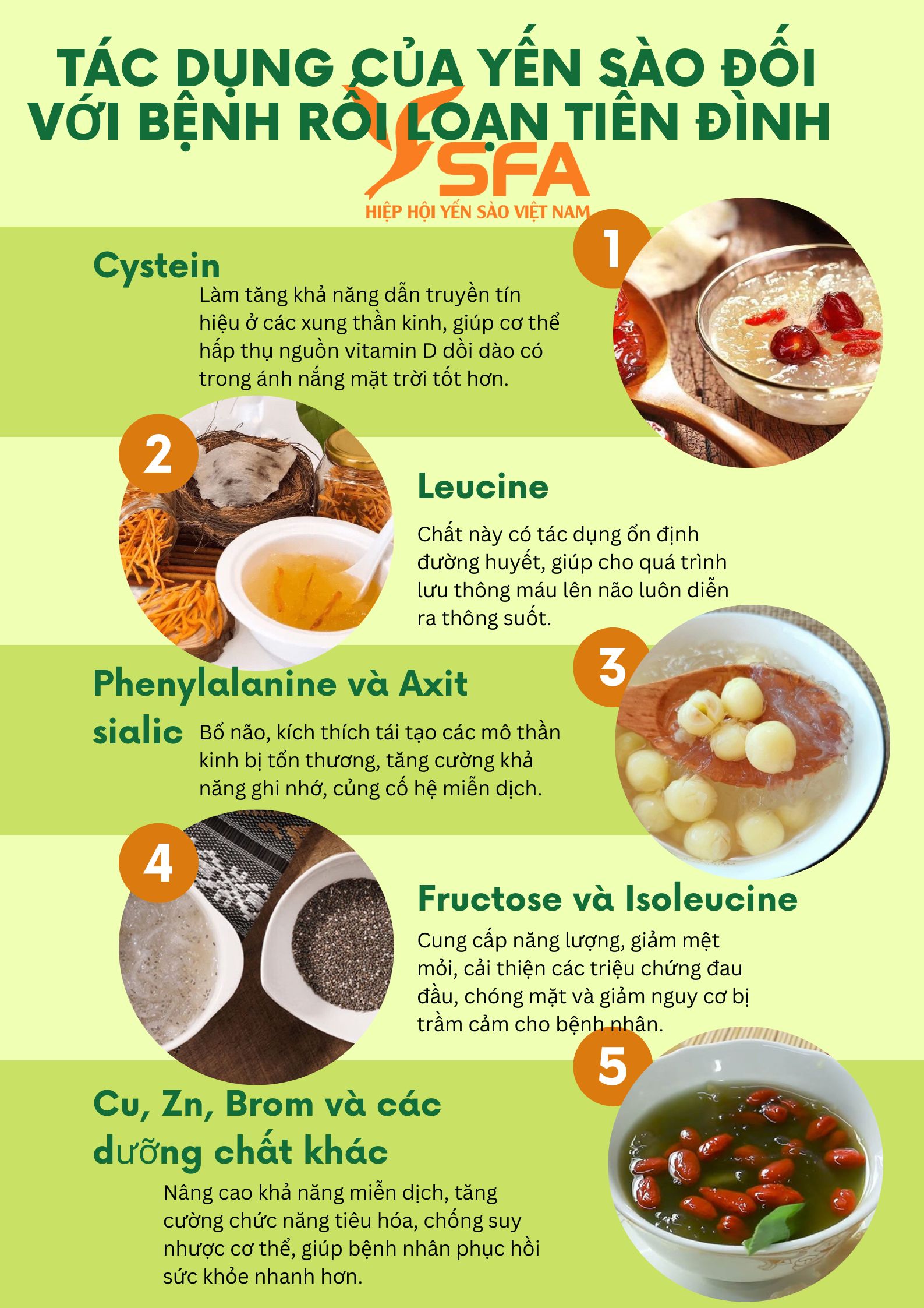 Theo nghiên cứu, trong tổ yến chứa đến hơn 30 loại nguyên tố vi lượng cùng 18 loại axit amin khác nhau. Ngoài ra, thực phẩm này còn cung cấp các dưỡng chất khác như năng lượng, protein, sắt, kẽm, đồng, crom, natri, canxi, Phenylalanine, Fructoso, Isoleucine, axit sialic, Cystein… Thường xuyên ăn yến mang đến nhiều lợi ích cho sức khỏe như:
